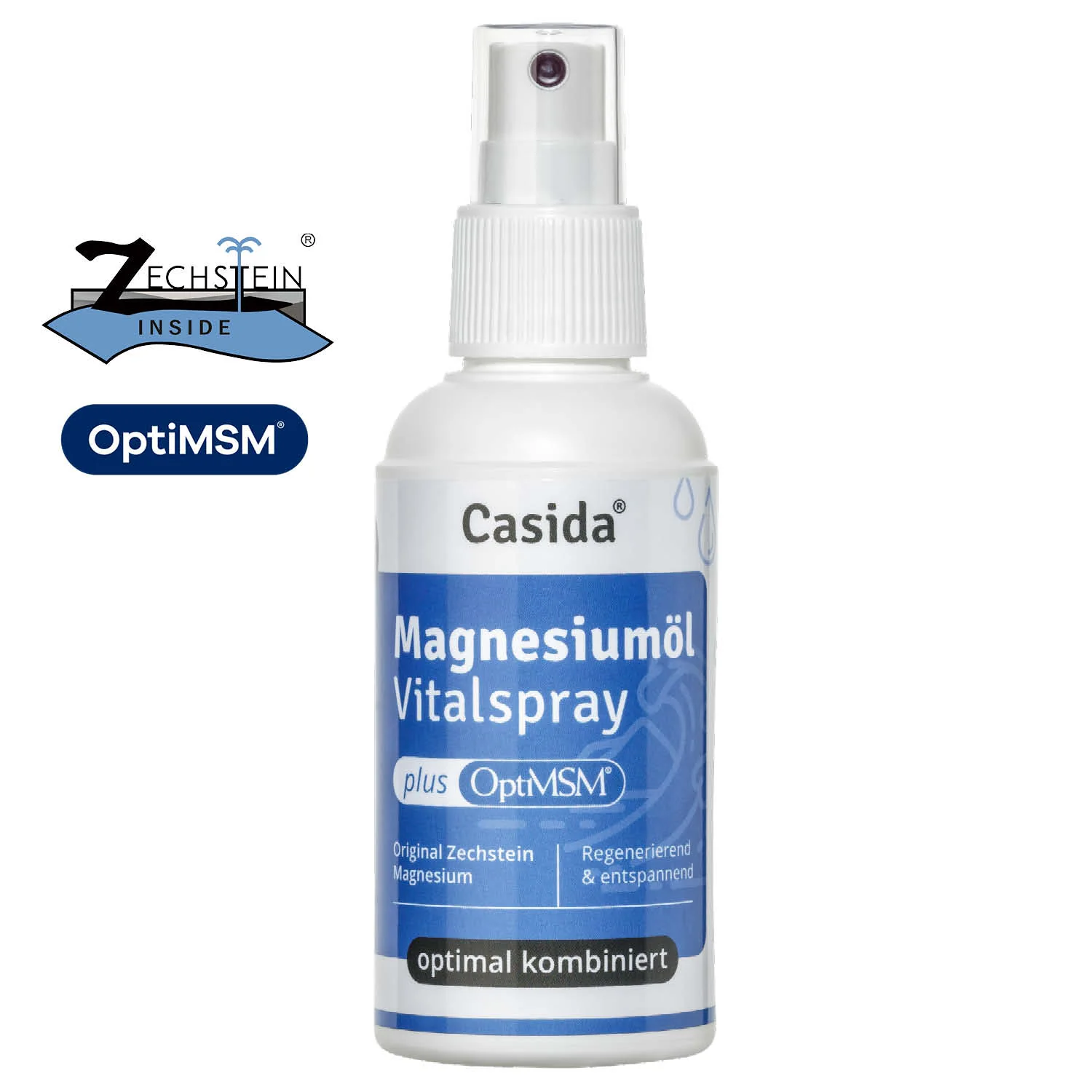 Das Magnesiumöl + MSM Vitalspray ist eine Magnesiumchlorid-Lösung mit OptiMSM® zum Auftragen von Magnesium auf die Haut. Das Spray enthält 31 % Magnesium und zusätzlich gelöstes MSM und wird äußerlich zur Massage, Regeneration und Pflege angewendet. OptiMSM® is a trademark of Balchem Corporation or its subsidiaries Casida Magnesiumöl + MSM Vitalspray gibt es in jeder Apotheke Auch erhältlich in deiner Apotheke Bestellnummer / PZN: 14364349 (DE), 4895726 (AT) Durch hochwertige, zertifizierte Inhaltsstoffe und ausgewählte Lieferanten Apotheker-Expertenwissen für die optimale Wirkung pflanzlicher Rohstoffe Wir achten bei jedem Produkt auf natürliche und nachhaltige Inhaltsstoffe