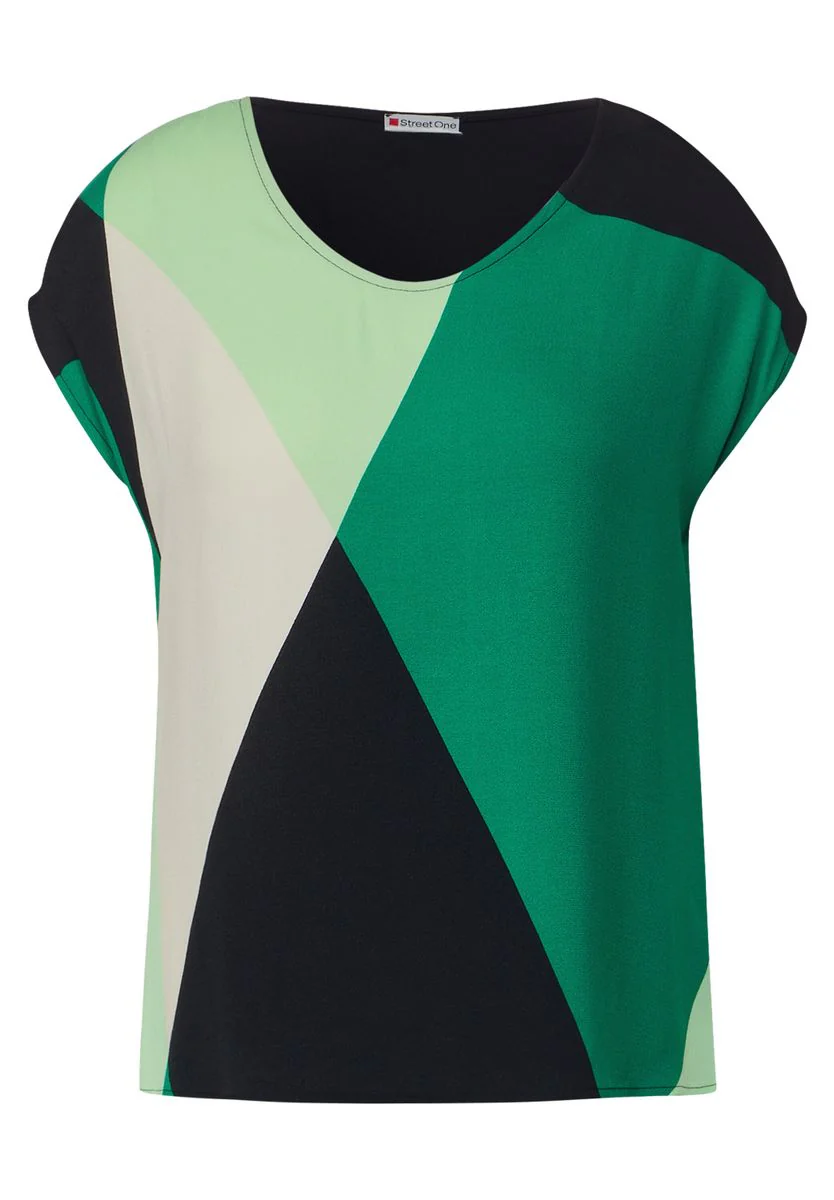 Das ärmellose Materialmix Shirt von Street One zeichnet sich durch seinen gerundeten V-Ausschnitt und dem auffälligen Muster auf der Front aus, welches es zu einem echten Blickfang macht. Der Materialmix sorgt für angenehmen Tragekomfort, und das einfarbige Jersey-Rückteil bietet eine bequeme Passform. Ein perfektes Shirt für einen lässigen und dennoch stilvollen Look.